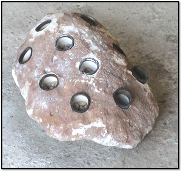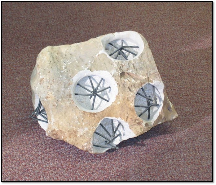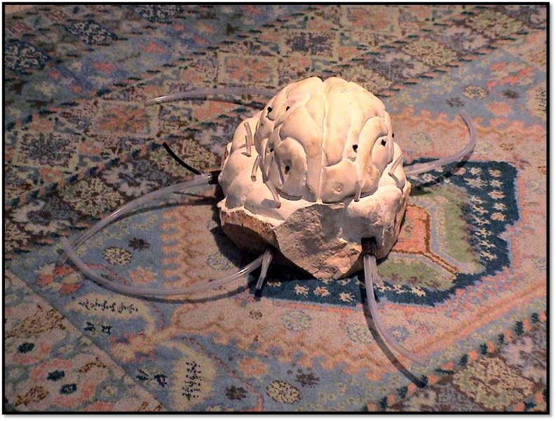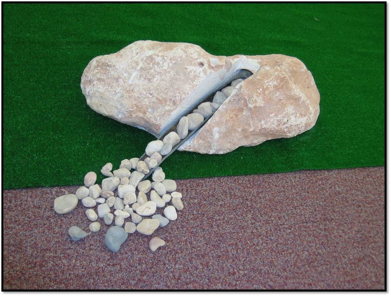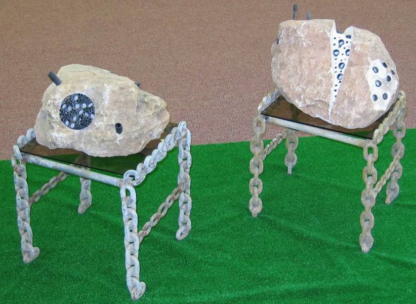 Avi Sperber created a new prophetic apocalyptic environment, a world full of new and unknown creatures, wild situations, structural mutations and impossible imaginations. The exhibition’s landscape is comprised of naturally split rocks in which one can find locked worlds, which include synthetic industrial materials such as parts of pipes, metal cables, recycled functional accessories from momentary life, everyone’s daily life. The stone sculptures are likened to synthetic fossils connected to ordinary objects that are lacking in creative power. The sculptures stand on huge metal installations which provide them with a futuristic presence and create a combined space of fantastic images of surrealistic colorful connections.